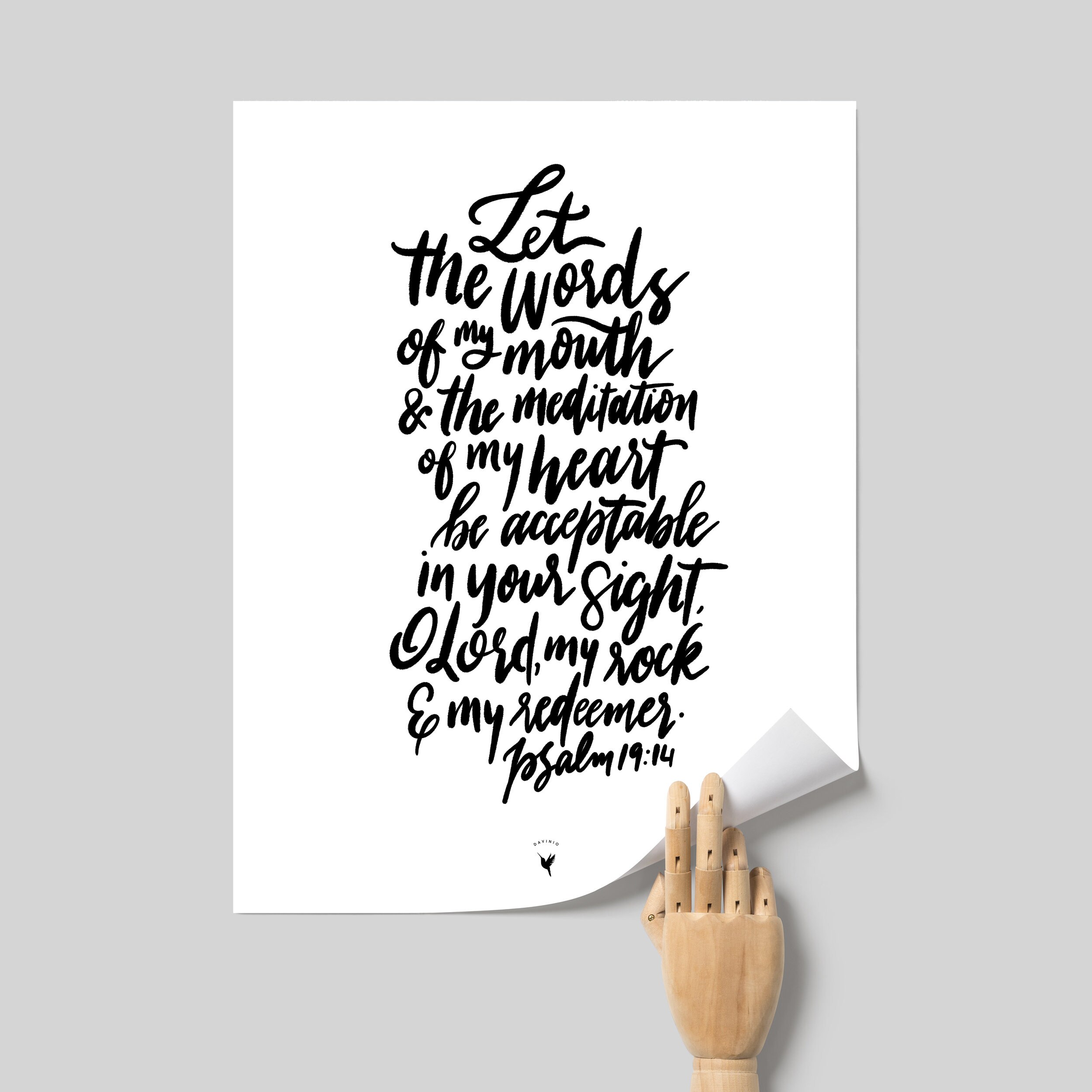 These words have been taped to my bathroom mirror for over a year. Let the words of my mouth and the meditation of my heart be acceptable to you O Lord my rock and my redeemer. And the meditation of my heart be pleasing. 14 Let the words of my mouth and the meditation of my heart be acceptable to you O Lord my.